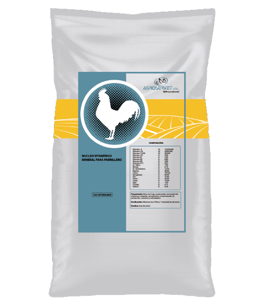 Vitamina A, Vitamina D3, Vitamina E-50, Vitamina K3 , Vitamina B1,Vitamina B2, Vitamina B6, Vitamina B12, Ac. Fólico, Biotina , Ac.Pantoténico, Niacina, Biocolina,Oxido de Manganeso, Oxido de Zinc, Sulfato de Hierro, Sulfato de Cobre, Iodato de Calcio, Carbonato de Cobalto, Selenito de Sodio
